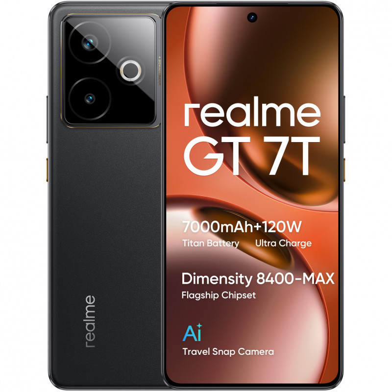 "realme GT 7T. Display diagonal: 17.3 cm (6.8""), Display resolution: 2800 x 1280 pixels. Processor family: MediaTek Dimensity. RAM capacity: 12 GB, Internal storage capacity: 512 GB. Rear camera resolution (numeric): 50 MP, Rear camera type: Dual camera. SIM card capability: Dual SIM. Operating system installed: Android 15. Battery capacity: 7000 mAh. Product colour: Black"\n