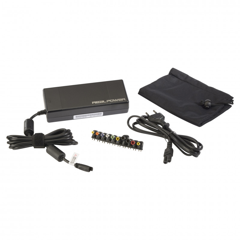 "RealPower 140474. Purpose: Laptop, Power supply type: Indoor, Input voltage: 100 - 240 V. Product colour: Black. Certification: CE, CB, TÜV. Weight: 254 g. Package width: 240 mm, Package depth: 165 mm, Package height: 80 mm"\n"RealPower UNA-40 universal notebook charger