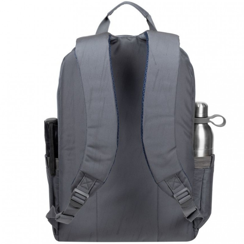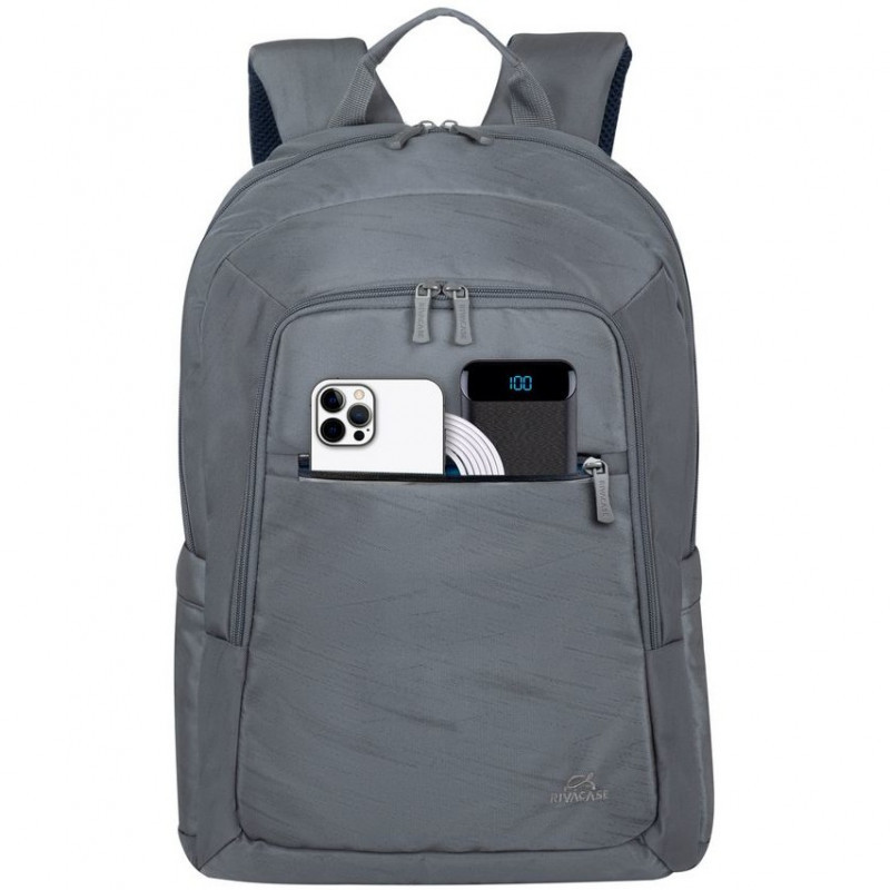 "Rivacase Alpendorf 7561. Backpack type: Casual backpack, Product main colour: Grey, Style: Urban. Sustainability certificates: Global Recycled Standard (GRS). Width: 305 mm, Depth: 150 mm, Height: 460 mm. Material: Polyester, Material details: RPET Polyester"\n"Manufactured using ECO-FRIENDLY RPET polyester made from multiple used plastic bottles that may have ended up as landfill or in the oceans. The equivalent of 12 × 500ml plastic bottles is used in the production of each backpack. "