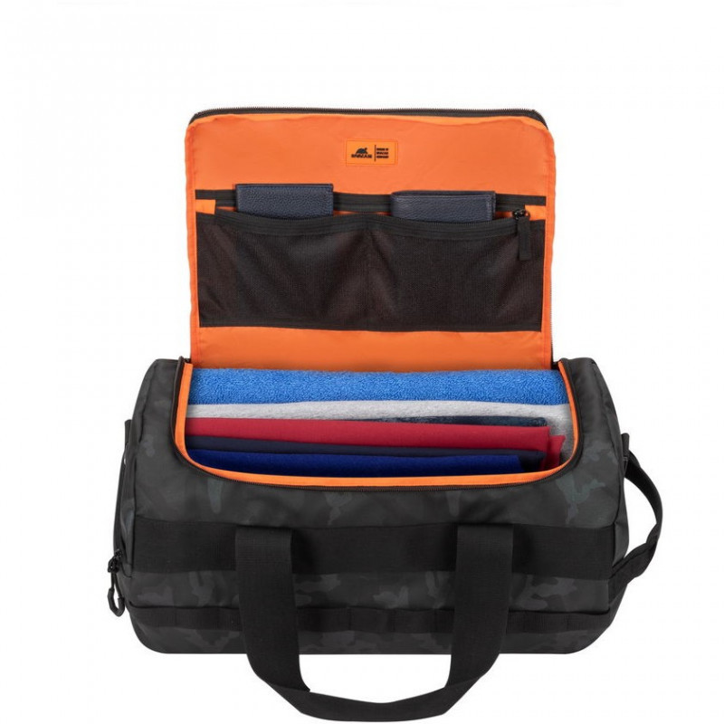 "Rivacase Sherwood. Product main colour: Camouflage, Best uses: Travel, Volume: 30 L. Width: 450 mm, Depth: 250 mm, Height: 280 mm"\n"MILITARY-STYLE DUFFLE BAG WITH MOLLE-WEBBING ELEMENTS OF DESIGN
