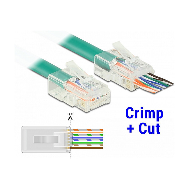 The RJ45 Crimp+Cut plug allows leading the wires out to the front; this speeds up the installation and the wiring order can be checked. At the same time, the performance is improved because the wire pair remains twisted close to the connector. When crimping, all wires are contacted simultaneously and the excess cable ends are cut off."