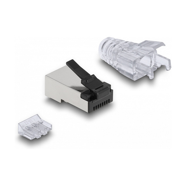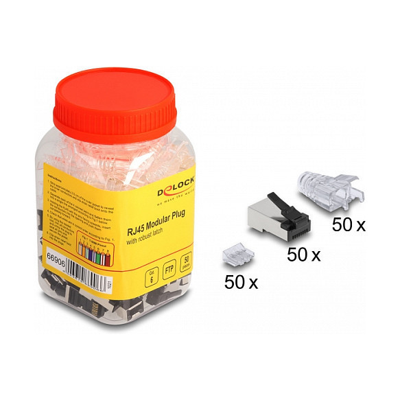 "DeLOCK RJ45 Modular Plug with robust latch Cat.6 and bend protection boots 50 pcs set. Connector(s): RJ-45, Product colour: Black, Metallic, Transparent, Connector gender: Male. Width: 15 mm, Depth: 22.5 mm, Height: 11.7 mm. Quantity per pack: 50 pc(s), Package type: Plastic jar"\n"This high quality RJ45 plug set by Delock includes shielded RJ45 plugs, suitable bend protection boots and a cable manager for optimal assembly installation of cables from 26 - 23 AWG.