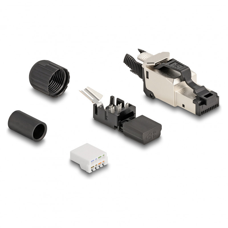 "DeLOCK RJ45 Plug field assembly Cat.6A. Connector(s): RJ45/LSA, Product colour: Black, Silver, Connector gender: Male. Width: 16.4 mm, Depth: 48.7 mm, Height: 13.9 mm. Quantity per pack: 1 pc(s), Package type: Polybag. Country of origin: Taiwan"\n"This RJ45 plug by Delock can be used to connect network cables. Installation of the plug to various cable types is tool-free and time-saving."