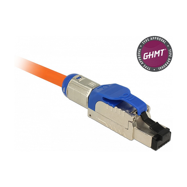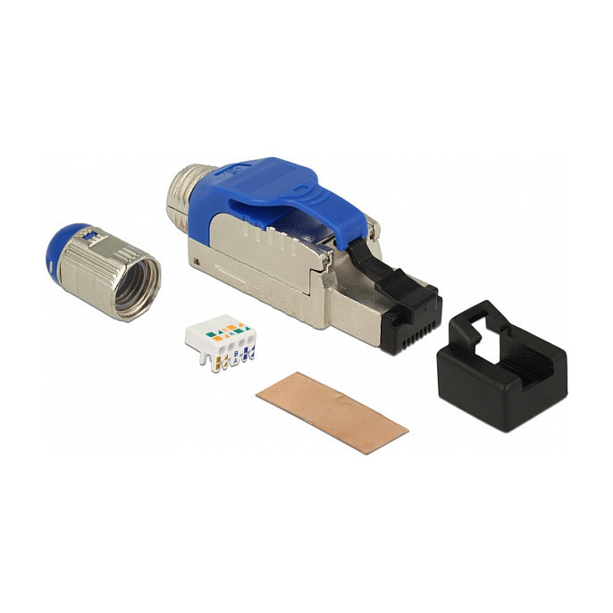 "DeLOCK 86487. Connector(s): RJ-45, Product colour: Blue, Silver, Material: Zinc. Width: 18.4 mm, Depth: 66 mm, Height: 13.8 mm. Package type: Polybag"\n"This RJ45 plug by Delock can be used to connect network cables. Installation of the plug to various cable types is tool-free and time-saving."