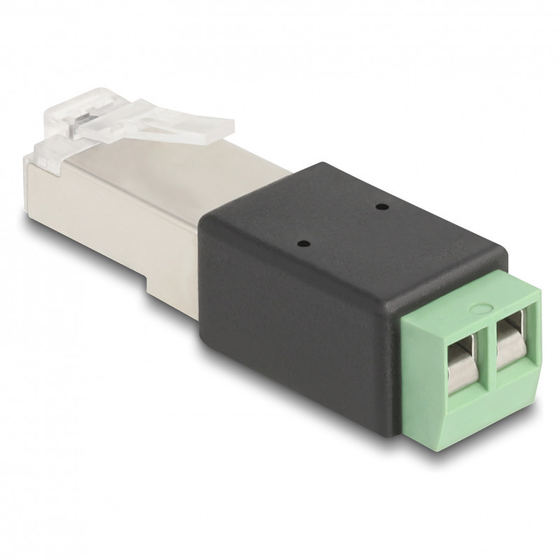 "DeLOCK RJ45 plug to Terminal Block Adapter 2 pin. Connector 1: RJ45, Connector 2: 2 pin terminal block. Product colour: Black, Green"\n"This terminal block adapter by Delock can be used to connect bare wires. The adapter is suitable for industry applications as well for the hobby area."