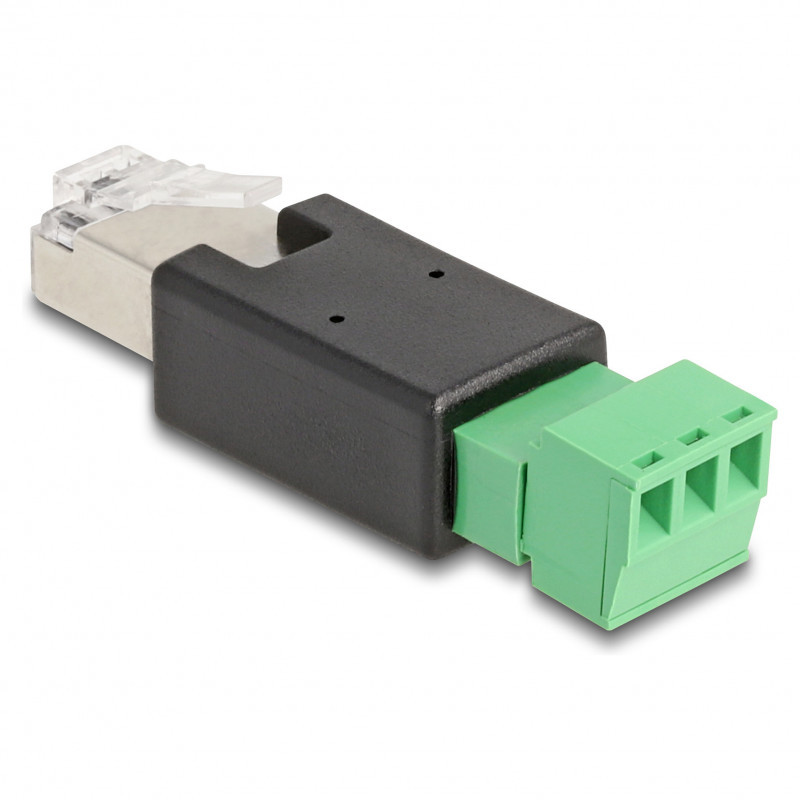 "DeLOCK 66607. Connector 1: RJ45, Connector 2: 3 pin terminal block. Product colour: Black, Green"\n"This terminal block adapter by Delock can be used to connect bare wires. The adapter is suitable for industry applications as well for the hobby area."