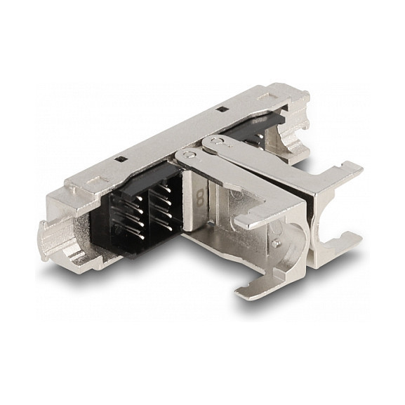 "DeLOCK RJ45 Coupler LSA to LSA with strain relief Cat.8.1 toolfree. Connector(s): LSA, Product colour: Black, Metallic, Connector gender: Female/Female. Width: 15.9 mm, Depth: 107 mm, Height: 15.4 mm. Quantity per pack: 1 pc(s)"\n"This coupler by Delock can be used to connect, extend or repair twisted pair cables. The sturdy metal housing ensures a secure and long-lasting connection.
