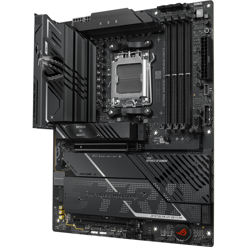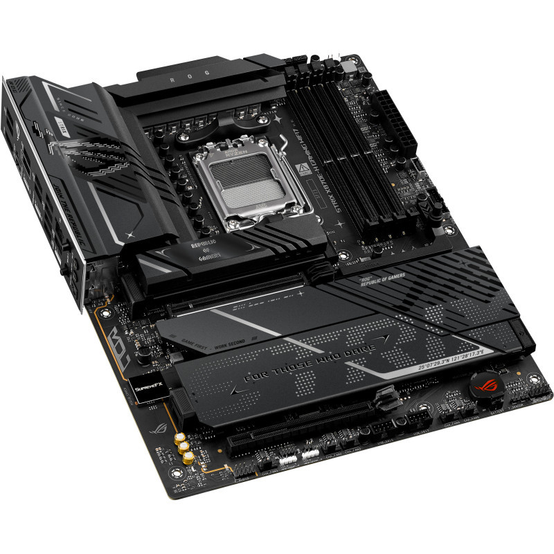 "ASUS ROG STRIX X870E-H GAMING WIFI7. Processor manufacturer: AMD, Processor socket: Socket AM5, Compatible processor series: AMD Ryzen 7000 Series, AMD Ryzen 8000 Series, AMD Ryzen 9000 Series. Supported memory types: DDR5-SDRAM, Maximum internal memory: 256 GB, Memory slots type: DIMM. Supported storage drive interfaces: M.2, SATA III, Supported storage drive types: HDD & SSD, RAID levels: 0, 1, 10, 5. Ethernet interface type: 5 Gigabit Ethernet, Top Wi-Fi standard: Wi-Fi 7 (802.11be), Wi-Fi standards: Wi-Fi 7 (802.11be). Component for: PC, Motherboard form factor: ATX, Motherboard chipset family: AMD"\n"ROG STRIX X870E-H GAMING WIFI7