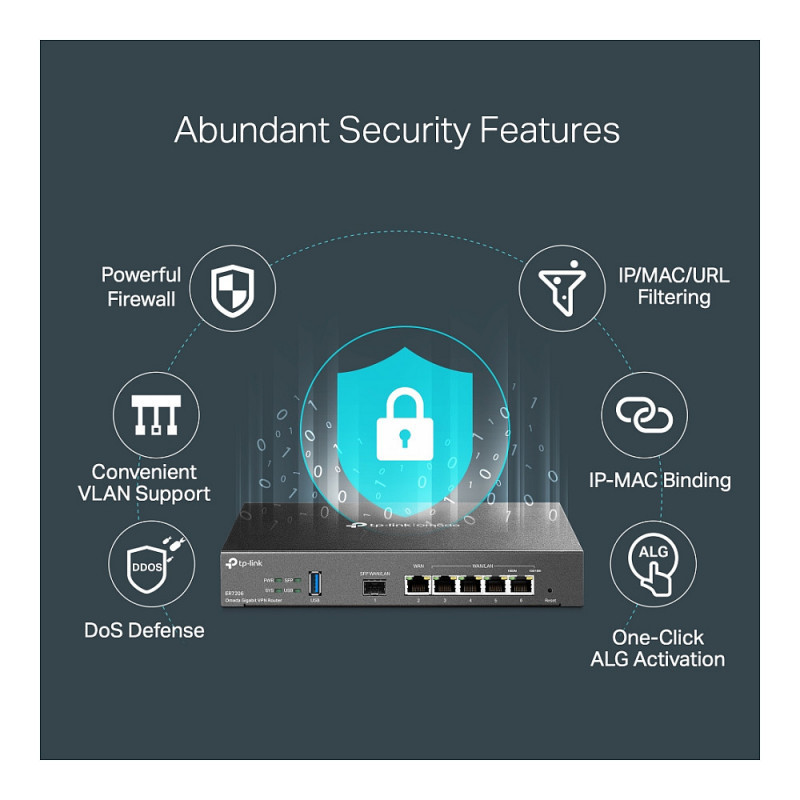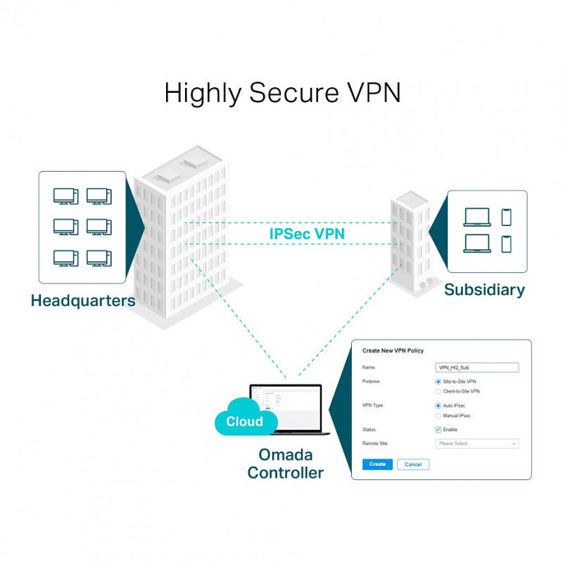 ER7206 supports IPSec/PPTP/L2TP VPN over IPSec/SSL protocols. With a powerful hardware design, the router supports and manages up to 100× LAN-to-LAN IPSec, 50× OpenVPN*, 50× L2TP, and 50× PPTP VPN connections. One-click auto IPSec VPN* greatly simplifies VPN configuration and facilitates network management and deployment while also securing and encrypting private site-to-site data communications traveling over the internet.