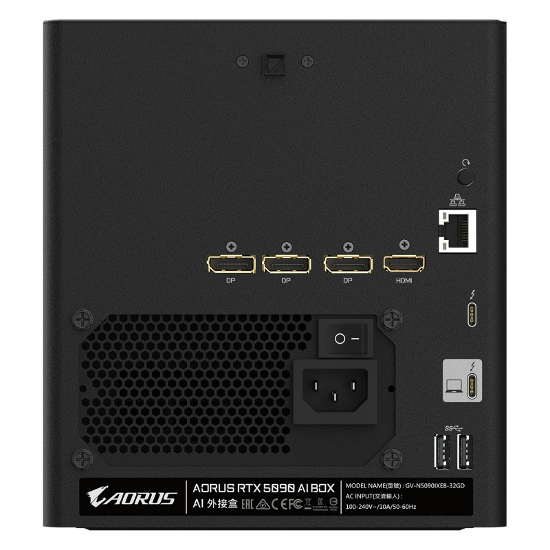 "GIGABYTE AORUS RTX 5090 AI BOX Graphics Card - 32GB GDDR7, 512bit, PCI-E 5.0, 2407MHz Core Clock, 3 x DP 2.1, 1 x HDMI 2.1, GV-N5090IXEB-32GD 1.0. Housing colour: Black, Number of graphics cards supported: 1 pc(s). Graphics processor family: NVIDIA, Graphics processor: GeForce RTX 5090, Maximum resolution: 7680 x 4320 pixels. Width: 172 mm, Depth: 302 mm, Height: 189 mm. Cables included: AC, Thunderbolt. Power supply: 850 W, AC input voltage: 100 - 240 V, AC input frequency: 50 - 60 Hz"\n"Unlock unparalleled gaming prowess with GIGABYTE's NVIDIA graphics cards. Engineered for peak performance and visual excellence, our GPUs redefine gaming standards. With advanced cooling solutions and cutting-edge technologies, GIGABYTE NVIDIA graphics cards deliver stunning visuals and seamless gameplay experiences, empowering gamers to dominate every virtual battlefield with confidence and precision."