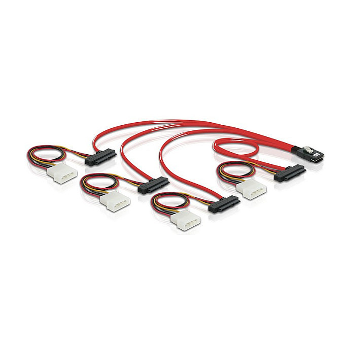 "DeLOCK 83146. Cable length: 1 m, Connector 1: mini SAS 36-pin, Connector 2: 4x SAS 29pin (SFF 8087 > 4x SFF 8482 + 5.25)"\n"This mini SAS cable to 4x SAS 29pin, enables you to connect e.g. a controller with mini SAS 36pin connector (SFF 8087) to 4 SAS (SFF 8482) HDD.