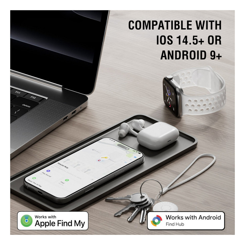 "4smarts Location Finder SkyTag Duos Set of 4, white. Purpose: Personal, Product type: Finder, Product colour: White. Battery type: CR2032, Battery capacity: 210 mAh. Mobile operating systems supported: Android, Android 9.0, iOS, iOS 14.5. Weight: 8.1 g, Depth: 7.6 mm, Diameter: 3.18 cm. Quantity per pack: 4 pc(s)"\n"Your smart companion for Apple or Android
