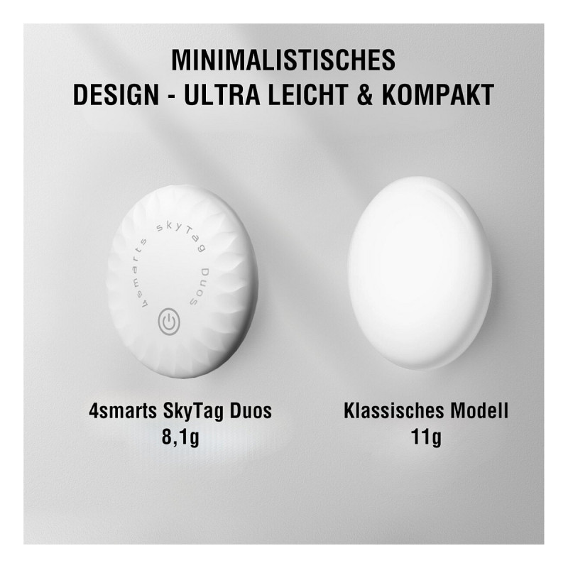 The SkyTag Duos combines functionality with a modern look. With a diameter similar to the Apple AirTag but even slimmer and lighter, it impresses with its stylish design. Weighing just 8.1 g, it’s compact enough to fit discreetly into any pocket, wallet, or luggage. Despite its ultra-thin 7.6 mm build, it delivers maximum performance without being noticeable or intrusive. This minimalist design makes the SkyTag Duos a perfect companion that blends seamlessly into your daily routine.