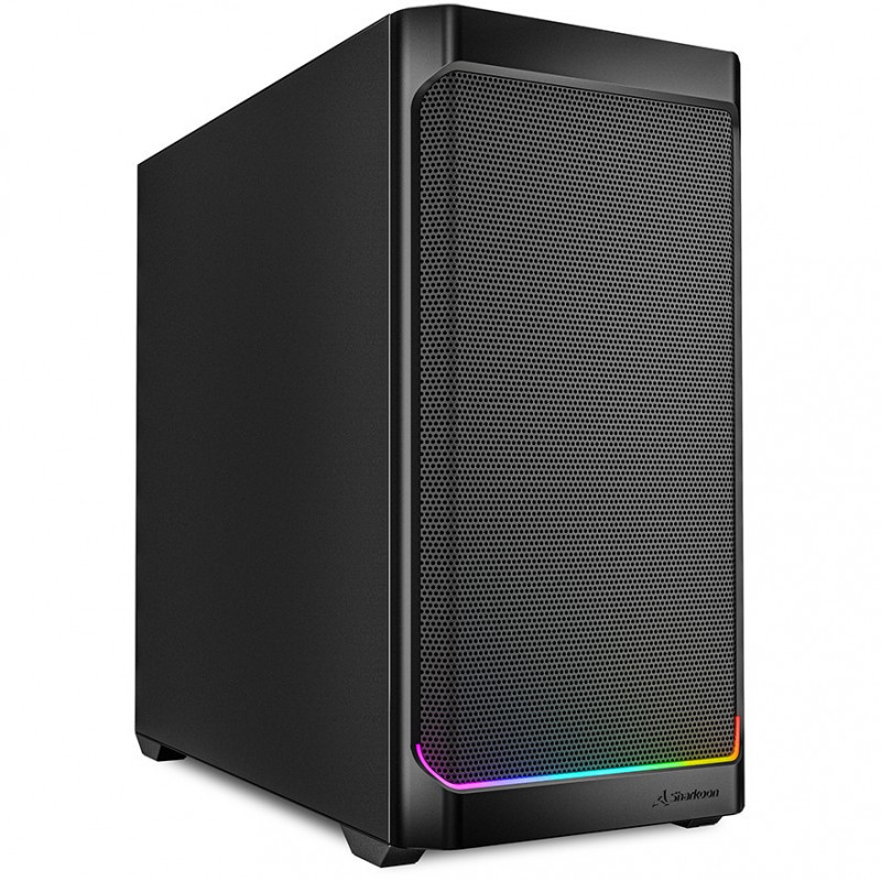 "Sharkoon MK4 RGB Strip. Form factor: Micro Tower, Type: PC, Product colour: Black. Front fans installed: 1x 120 mm, Front fans diameters supported: 120 mm, Side fans diameters supported: 120,140 mm. Supported HDD sizes: 2.5,3.5"". Width: 225 mm, Depth: 460 mm, Height: 445 mm"\n"Functional and stylish: Despite its compact micro-ATX form factor, the MK4 RGB Strip has plenty of space for modern hardware and room for up to eleven fans. The case presents itself in a solid, classic look, while the front panel has an integrated RGB strip along the base of the air-permeable mesh, providing a subtle visual contrast with 16.7 million colors. On the top panel, the case is rounded off with up-to-date ports for a wide range of mobile and peripheral devices.