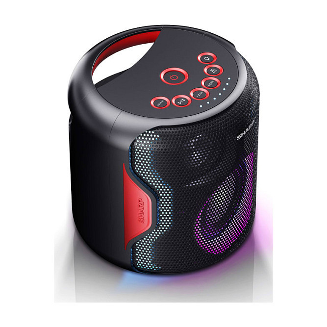 "Sharp PS-921. Audio output channels: 2.1 channels, Driver diameter: 5.08 cm, Subwoofer driver diameter: 10.2 cm. Peak Music Power Output (PMPO): 130 W. Connectivity technology: Wireless, Bluetooth version: 5.0+EDR, Bluetooth profiles: A2DP, AVRCP. Product type: 2.1 portable speaker system, Product colour: Black, Housing material: Plastic. Certification: CE (RED, RoHS, ErP), REACH/PAH/SCCP"\n"A compact, portable Bluetooth® party speaker with disco lights and 3D spatial audio. Splashproof, suitable for use on the beach, by the pool or in light rain."