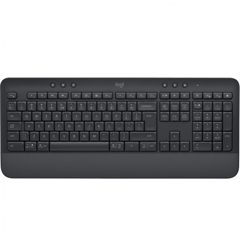 "Logitech SIGNATURE K650. Type in comfort. Get more done. Keyboard form factor: Full-size (100%). Keyboard style: Straight. Connectivity technology: Wireless, Device interface: Bluetooth, Keyboard key switch: Membrane, Keyboard layout: QWERTZ. Wrist rest. Recommended usage: Office. Product colour: Graphite"\n"TYPE IN COMFORT GET MORE DONE