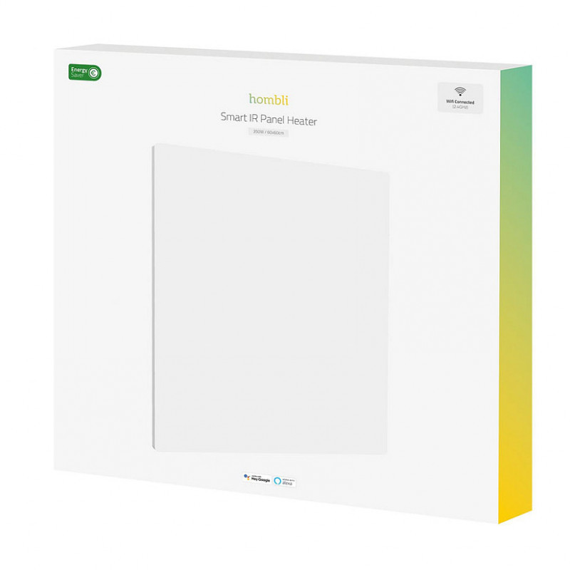 "Hombli Smart Infrared Panel Heater. Type: Infrared electric space heater, International Protection (IP) code: IP24. Suitable for: Indoor, Placement options: Floor, Wall, Product colour: White. Heating power: 350 W. Width: 600 mm, Depth: 50 mm, Height: 600 mm. Quantity per pack: 1 pc(s)"\n"Easily reduce your energy consumption by heating only the necessary rooms in your home with the stylish Hombli Smart IR Panel Heater. Through the Hombli app, you can easily set schedules and control the temperature of different rooms in your house from any location. The timeless design of the Smart IR Panel Heater effortlessly matches any interior.