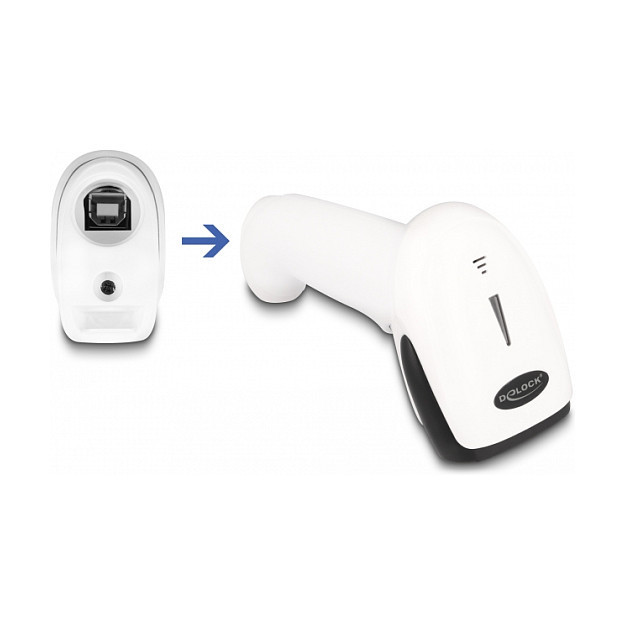 "DeLOCK Barcode Scanner 1D and 2D for 2.4 GHz, Bluetooth or USB - white. Type: Handheld bar code reader, Scanner type: 1D/2D, Sensor type: CMOS. Connectivity technology: Wireless, Standard interfaces: Bluetooth, USB, Operating frequency: 2400 MHz. Product colour: White. Power source type: Battery, Battery capacity: 1800 mAh, Input voltage: 5 V. Weight: 190 g, Width: 90 mm, Depth: 170 mm"\n"This barcode scanner by Delock can be wirelessly connected to a PC, laptop or directly to a mobile phone or tablet. All common 1D and 2D barcode types can be precisely captured even at long distances. Additionally, the scanner recognizes barcodes displayed on displays and monitors.