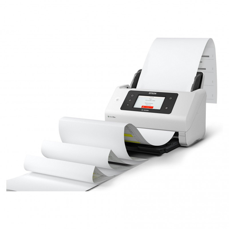 "Epson WorkForce DS-900WN. Maximum scan size: 215.9 x 6096 mm, Optical scanning resolution: 600 x 600 DPI, Input colour depth: 30 bit. Scanner type: Sheet-fed scanner, Product colour: White, Display: LCD. Daily duty cycle (max): 11000 pages, Scan file formats: BMP, JPEG, PDF, PNG, TIFF, Scan to: Cloud, E-mail, Network folder, PC, USB. Standard input capacity: 100 sheets, Auto document feeder (ADF) input capacity: 100 sheets. Maximum ISO A-series paper size: A4, Scanning media types supported: Business Card, Envelopes, Plastic Card, ISO A-series sizes (A0...A9): A3, A4, A5, A6"\n"Open platform