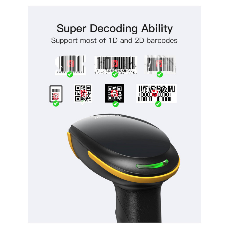 "Inateck BCST-23. Type: Handheld bar code reader, Scanner type: 2D, Sensor type: CMOS. Connectivity technology: Wired & Wireless, Standard interfaces: Bluetooth, USB. Product colour: Black, Yellow, Housing material: Acrylonitrile butadiene styrene (ABS), Polycarbonate (PC), Thermoplastic urethane (TPU). Power source type: Battery, USB, Battery capacity: 2000 mAh. Weight: 205 g, Width: 90.9 mm, Depth: 68.3 mm"\n"Super Decoding Capability: Utilizing a 300,000-pixel 2D module for recognition, it supports most 1D and 2D barcodes. It quickly reads blurry, damaged, dirty, wrinkled, and distorted barcodes under strong and dim lighting conditions. (Inverted DM barcodes not supported.)