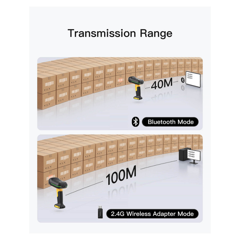 Wide Compatibility & Extended Transmission Range: Supports three connection modes—2.4G wireless, Bluetooth, and wired. Compatible with Windows, Mac, iOS, Android, iPad OS, and Linux, catering to various scanning needs. In open environments, the transmission distance reaches up to 100 meters, while in indoor settings, it extends to 60 meters