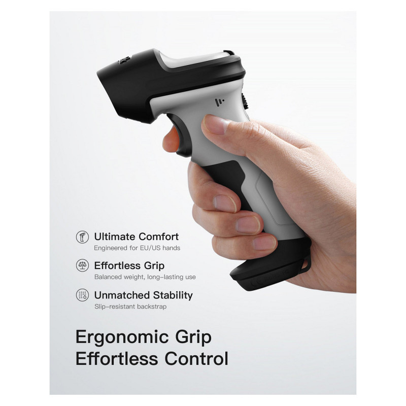 "Inateck BCST-70-AI. Type: Handheld bar code reader, Scanner type: 1D, Sensor type: Laser. Connectivity technology: Wireless, Standard interfaces: Bluetooth, USB. Product colour: Black, Grey, Housing material: Polycarbonate (PC), Thermoplastic urethane (TPU), Protection features: Shockproof. Power source type: Battery, Battery capacity: 2600 mAh. Weight: 200 g, Width: 92 mm, Depth: 69 mm"\n"Strong Recognition Ability: Can read various types of 1D barcodes. Supports lightning scanning and upload of blurry or broken barcodes under strong and dim light