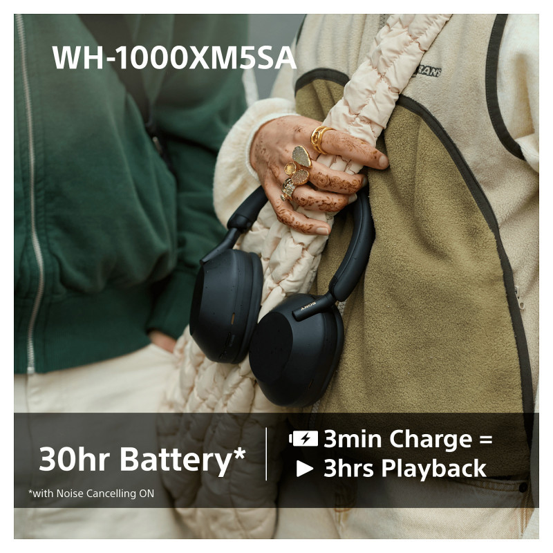 With a huge 30 hours of battery life you’ll have enough power even for long trips. If you need to top up in a hurry, you can get 3 hours' worth of charge after just 3 minutes with an optional USB-PD compatible AC adapter.ⓘ[The adapter is not included with WH-1000XM5SA.]"