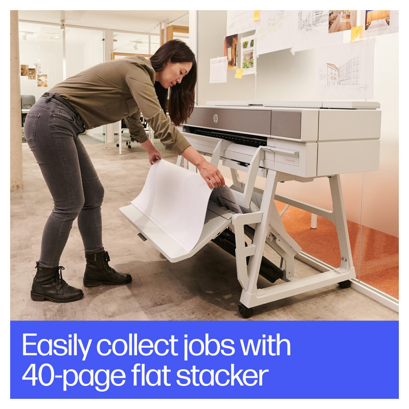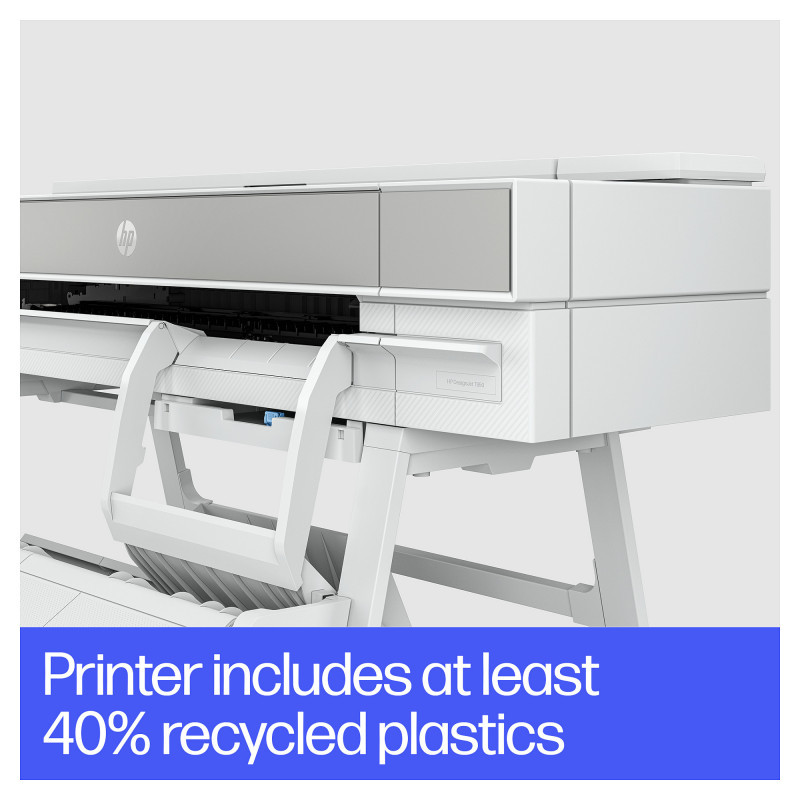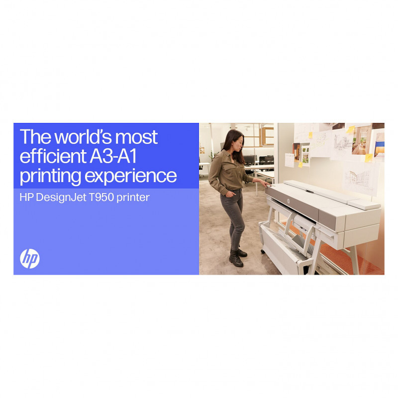 "HP DesignJet T950 36-in Printer. Print technology: Thermal inkjet, Maximum resolution: 2400 x 1200 DPI, Page description languages: PDF, HP-GL/2, TIFF, JPEG, HP-RTL, CALS G4, URF. Maximum print size: A0 (841 x 1189 mm), Paper tray media types: Coated paper, Plain paper, Bond paper, Photo paper, Matte paper, Banner, Heavy paper, Satin paper, ISO A-series sizes (A0...A9): A0, A1, A2, A3, A4. Ethernet LAN data rates: 1000 Mbit/s, Mobile printing technologies: HP ePrint. Product colour: White, Internal memory: 1024 MB, Country of origin: China, Thailand, Switzerland. Power consumption (standby): 0.2 W, Power consumption (typical): 30 W, Power consumption (off): 0.2 W"\n" Boost productivity with the world’s most efficient A4-A0 experience.[1] Do it all—print multi-size CAD and renders with the integrated input/output tray. Save time with HP Click. And go beyond with this robust and compact plotter.
