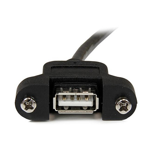 "StarTech.com 1 ft Panel Mount USB Cable A to A - F/M. Cable length: 0.3 m. Connector 1: USB A, Connector 2: USB A, USB version: USB 2.0, Connector gender: Male/Female, Product colour: Black"\n"Add an external panel mount USB connection to a PC or faceplate