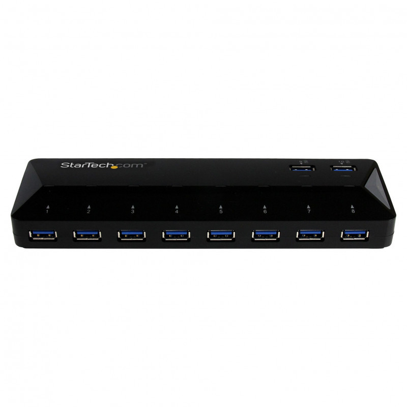 "StarTech.com 10-Port USB 3.0 Hub with Charge and Sync Ports - 2 x 1.5A Ports~10-Port USB 3.0 Hub with Charge and Sync Ports - 5Gbps - 2 x 1.5A Ports. Host interface: USB 3.2 Gen 1 (3.1 Gen 1) Type-B, Hub interfaces: USB 3.2 Gen 1 (3.1 Gen 1) Type-A. Data transfer rate: 5000 Mbit/s, Product colour: Black, Housing material: Plastic. Power supply type: DC, Power consumption (typical): 48 W, Input voltage: 100 - 240 V. Width: 60 mm, Depth: 201 mm, Height: 24 mm. Package width: 293 mm, Package depth: 194 mm, Package height: 73 mm"\n"Add ten USB 3.2 Gen 1 ports, including two charging downstream ports, to your computer