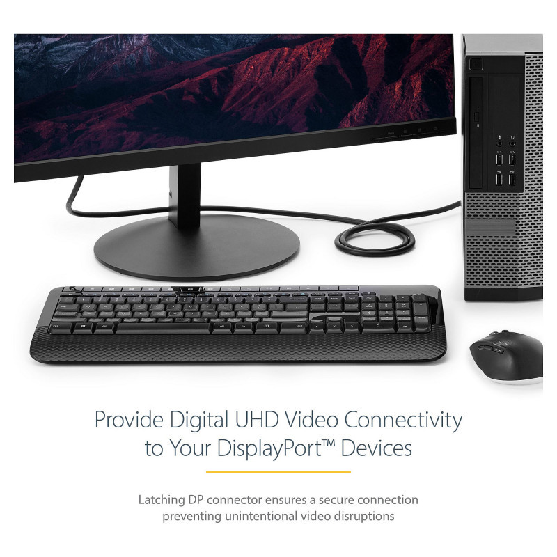 "StarTech.com 1m (3ft) DisplayPort 1.2 Cable - 4K x 2K Ultra HD VESA Certified DisplayPort Cable - DP to DP Cable for Monitor - DP Video/Display Cord - Latching DP Connectors. Cable length: 1 m, Connector 1: DisplayPort, Connector 2: DisplayPort. Compliance certificates: CE, RoHS. Cable diameter: 7.3 mm, Weight: 85 g. Package width: 200 mm, Package depth: 220 mm, Package height: 15 mm. Quantity per pack: 1 pc(s)"\n"Create high-resolution 4k x 2k connections with HBR2 support between your DisplayPort™-equipped devices