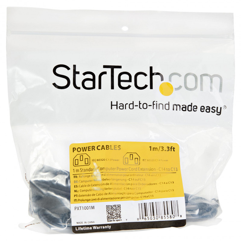 "StarTech.com 1m (3ft) Power Extension Cord, C14 to C13, 10A 125V, 18AWG, Computer Power Cord Extension, IEC-320-C14 to IEC-320-C13 AC Power Cable Extension for Power Supply, UL Listed. Cable length: 1 m, Connector 1: C14 coupler, Connector 2: C13 coupler, Cable type: SVT. Input voltage: 250 V, Input current: 5 A"\n"1m Power Extension Cord, C14 to C13, 10A 125V
