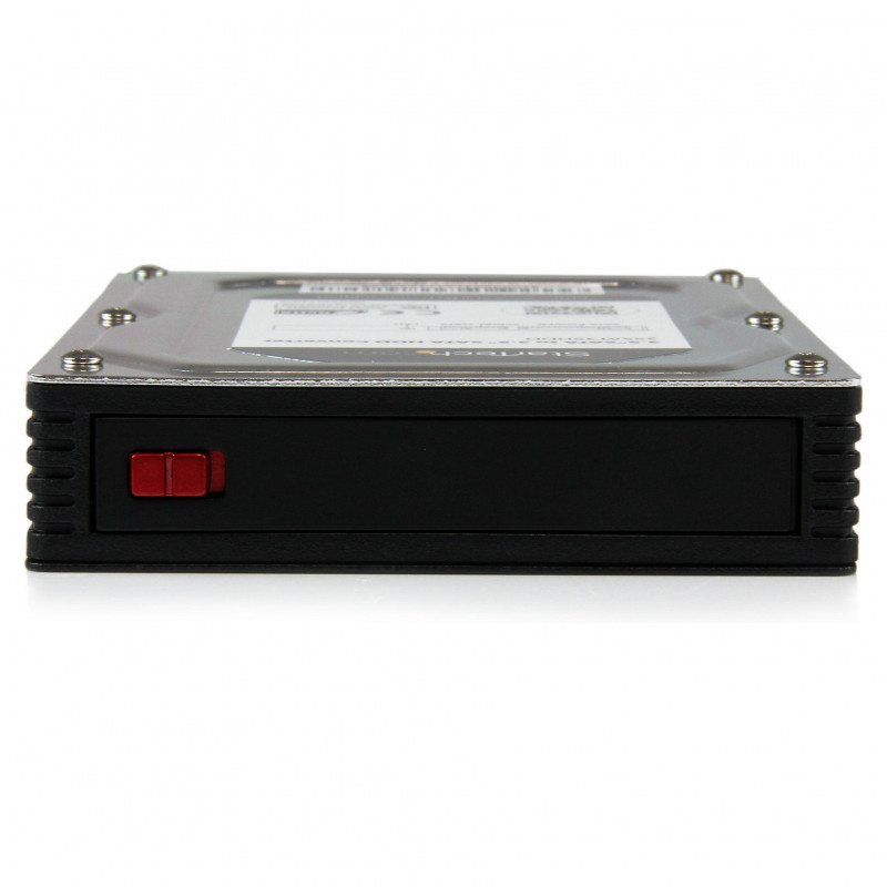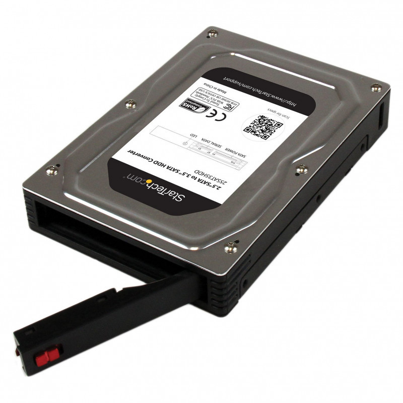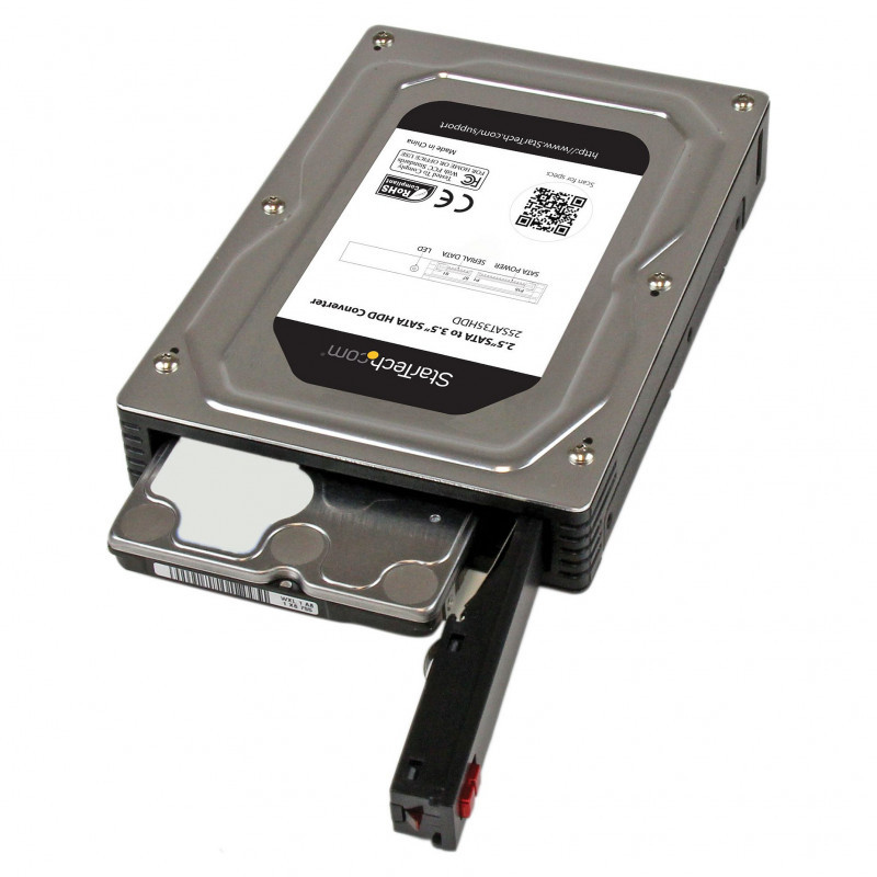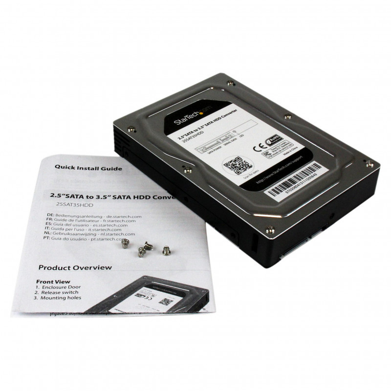 "StarTech.com 2.5” to 3.5” SATA Aluminum Hard Drive Adapter Enclosure with SSD / HDD Height up to 12.5mm. Size (imperial): 8.89 cm (3.5""), Type: Storage drive tray, Product colour: Black, Silver. Width: 102 mm, Depth: 146 mm, Height: 36 mm. Package width: 115 mm, Package depth: 163 mm, Package height: 38 mm. Cables included: SATA. Products per master (outer) case: 32 pc(s), Master (outer) case width: 313 mm, Master (outer) case length: 342 mm"\n"Turn a 2.5” SATA HDD/SSD into a 3.5” SATA Drive