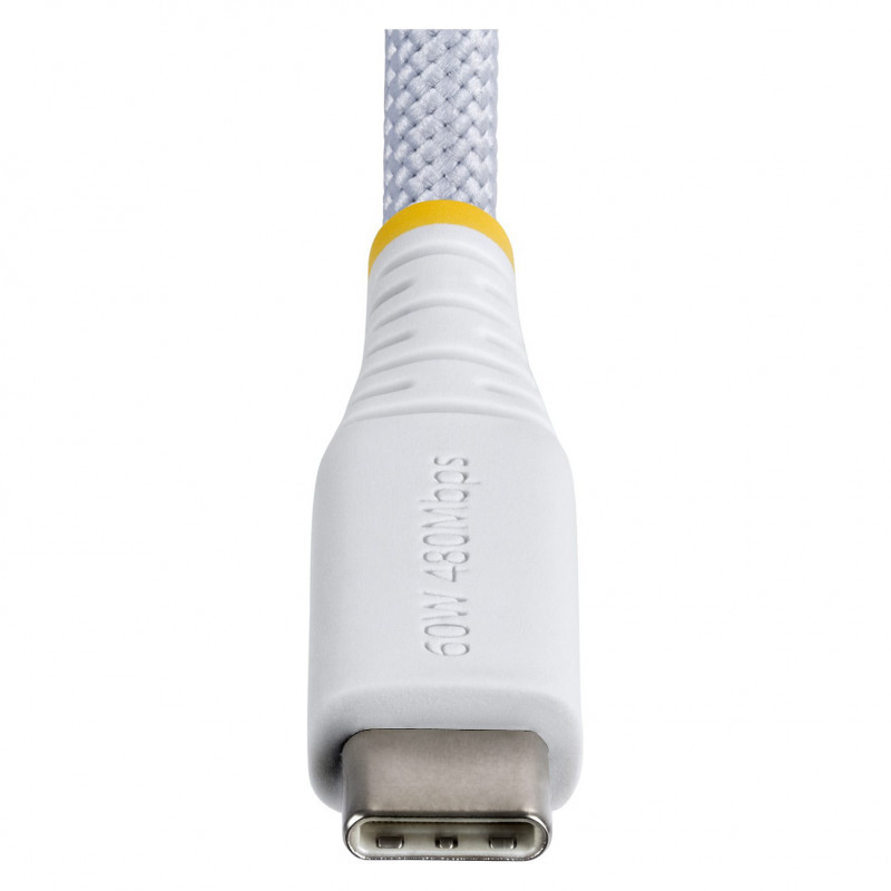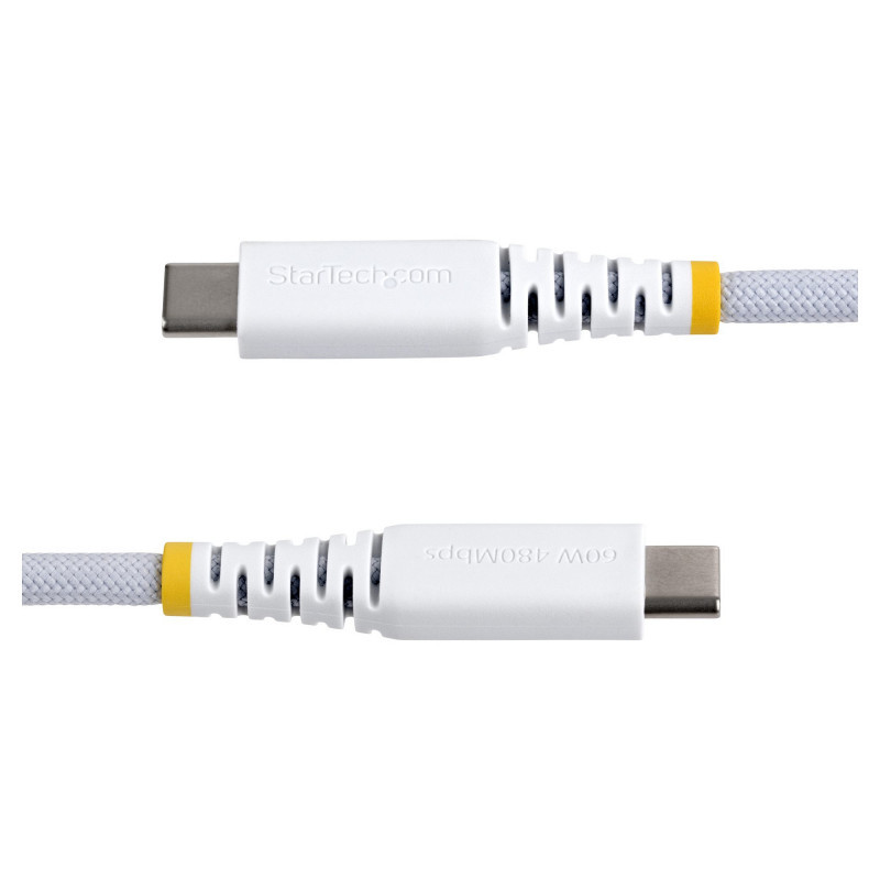 "StarTech.com 2m (6ft) White USB-C Charging Cable, 60W (3A) PD, Dual-Layer Braided Nylon/TPE Jacket, Rugged USB C Charging Cord, USB 2.0 Laptop Charger Cable. Cable length: 2 m. Connector 1: USB C, Connector 2: USB C, USB version: USB 2.0, Maximum data transfer rate: 0.48 Gbit/s, Connector contacts plating: Nickel, Product colour: White"\n"Connect a USB Type-C device to a USB-C wall charger or host computer