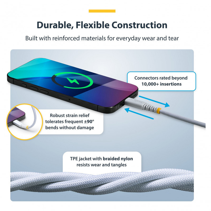 The USB-C Charging Cable features a TPE inner jacket with a braided nylon exterior for optimal flexibility and wear protection. The durable nickel-plated connectors are designed for frequent daily use, and are rated to operate beyond 10,000 insertion cycles.