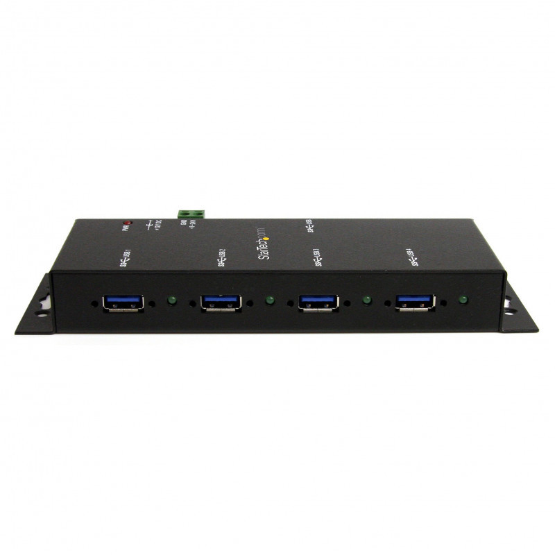 "StarTech.com 4-Port Industrial USB 3.0 Hub with ESD Protection~4-Port USB 3.0 Hub - 5Gbps - Metal Industrial USB-A Hub - Wall or Desk Mountable USB Data Hub - TAA Compliant USB Expander Hub. Host interface: USB 3.2 Gen 1 (3.1 Gen 1) Type-B, Hub interfaces: USB 3.2 Gen 1 (3.1 Gen 1) Type-A. Data transfer rate: 5000 Mbit/s, Product colour: Black, Housing material: Steel. Power consumption (typical): 36 W, Output voltage: 12 V, Output current: 3 A. Windows operating systems supported: Windows 10 Education, Windows 10 Education x64, Windows 10 Enterprise, Windows 10 Enterprise x64,..., Mac operating systems supported: Mac OS X 10.4 Tiger, Mac OS X 10.5 Leopard, Mac OS X 10.6 Snow Leopard. Width: 59.6 mm, Depth: 152 mm, Height: 24 mm"\n"Industrial-grade | 8kV Air | 4kV Contact | Metal | Mountable | 5 Gbps