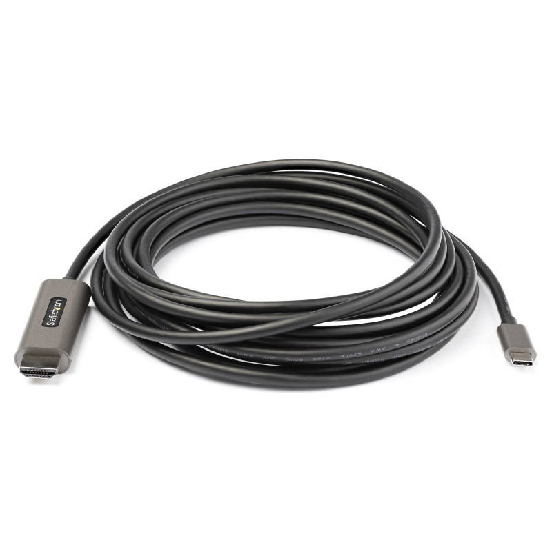 "StarTech.com 16ft (5m) USB C to HDMI Cable 4K 60Hz w/ HDR10 - Ultra HD USB Type-C to 4K HDMI 2.0b Video Adapter Cable - USB-C to HDMI HDR Monitor/Display Converter - DP 1.4 Alt Mode HBR3. Cable length: 5 m, Connector 1: HDMI Type A (Standard), Connector 2: USB Type-C. Compliance certificates: CE, RoHS. Weight: 199 g, Width: 12 mm, Height: 22 mm. Package width: 17 mm, Package depth: 5000 mm, Package height: 6 mm. Quantity per pack: 1 pc(s)"\n"USB Type-C™ Adapter Cable | HDR10 | Ultra HD | Thunderbolt™ 3 Host Compatible
