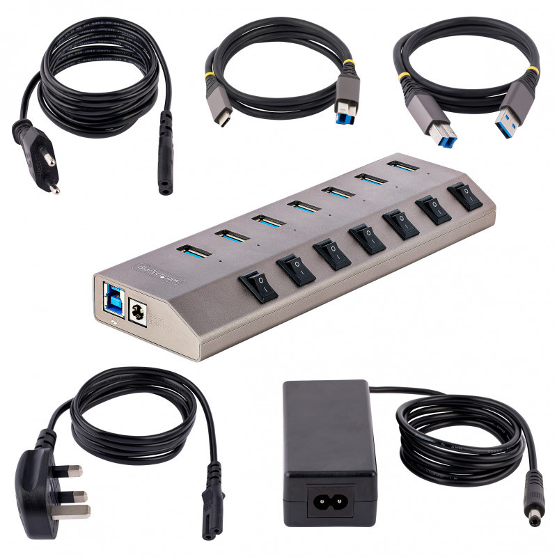 "StarTech.com 7-Port Self-Powered USB-C Hub with Individual On/Off Switches, USB 3.0 5Gbps Expansion Hub w/Power Supply, Desktop/Laptop USB-C to USB-A Hub, USB Type C Hub w/BC 1.2. Host interface: USB 3.2 Gen 1 (3.1 Gen 1) Type-B, Hub interfaces: USB 3.2 Gen 1 (3.1 Gen 1) Type-A. Data transfer rate: 5000 Mbit/s, Product colour: Grey, Housing material: Plastic. Power supply type: DC, Power consumption (typical): 65 W, Input voltage: 110 - 240 V. Width: 188 mm, Depth: 59 mm, Height: 21 mm. Package width: 225 mm, Package depth: 170 mm, Package height: 70 mm"\n"7-Port USB Hub | Individual On/Off Port Switches | USB 3.2 Gen 1 (5Gbps) | 3ft (1 m) USB-C & USB-A Host Cables Included