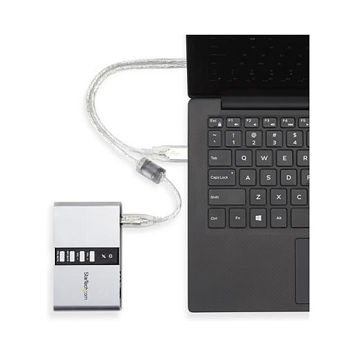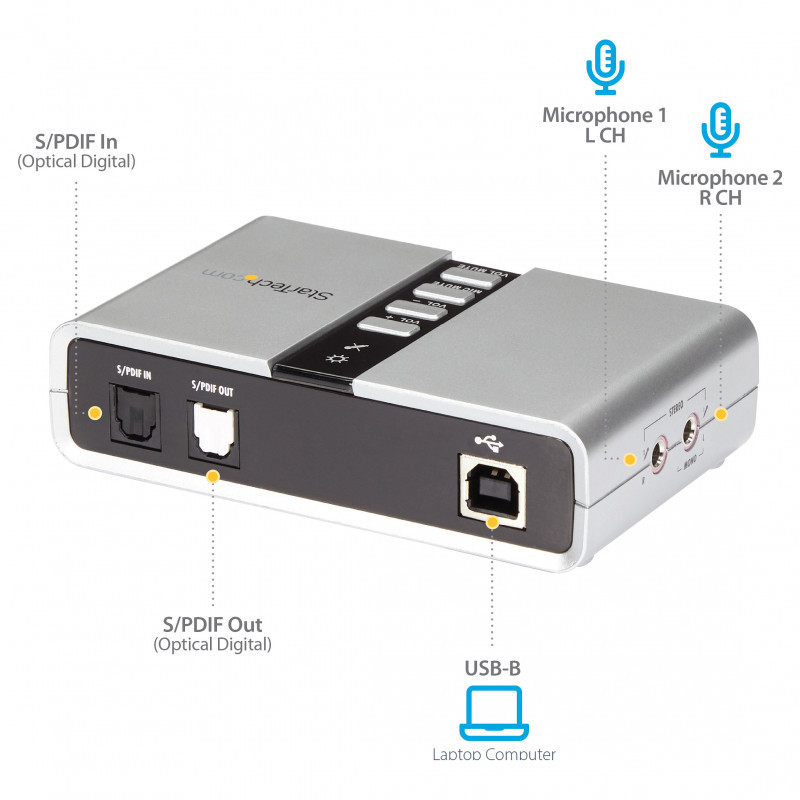 Providing a robust USB audio experience, the USB sound card connects to a host computer through a single USB 2.0 connection, to deliver impressive external audio capability that can instantly be swapped between systems, without having to open the computer case for installation.
