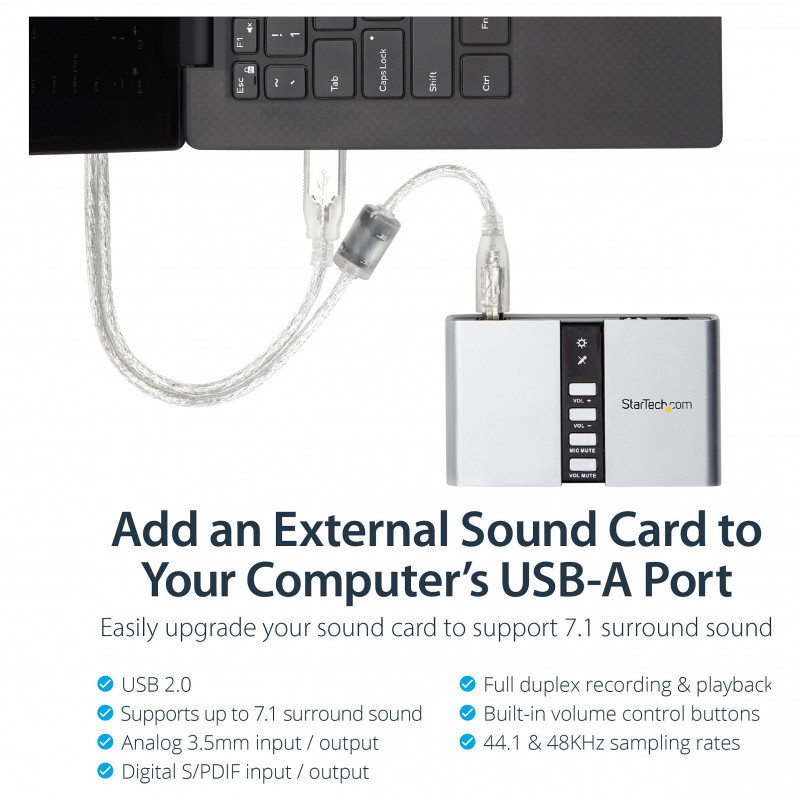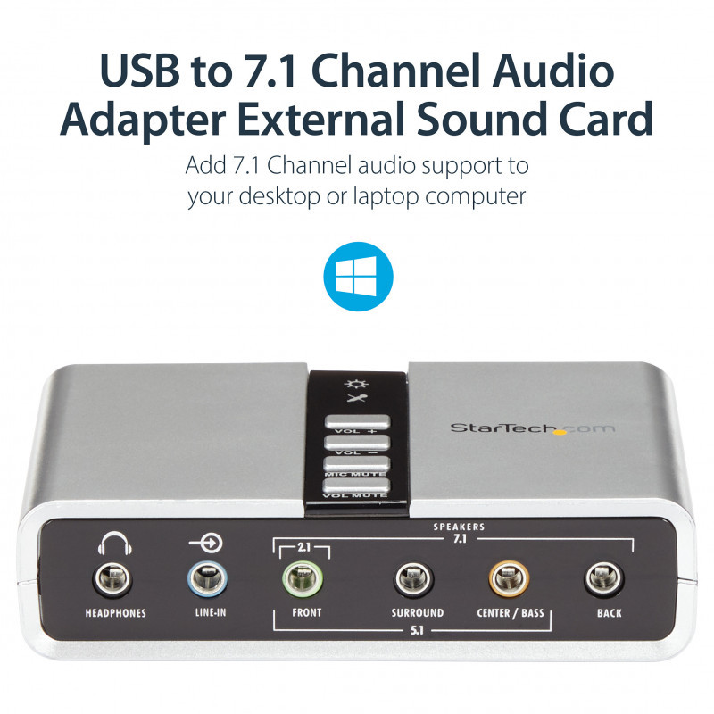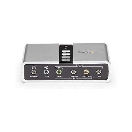 "StarTech.com 7.1 USB Audio Adapter External Sound Card with SPDIF Digital Audio. Audio output channels: 7.1 channels, Audio quality: 16 bit, Digital-to-Analog Conversion (DAC): 16-bit/48kHz. Host interface: USB. LED indicators: Activity, Power, Chipset: C-Media CM6206, Certification: RoHS, CE, FCC, REACH. Windows operating systems supported: Windows 10, Windows 10 Education, Windows 10 Education x64, Windows 10 Enterprise, Windows 10.... Weight: 90 g, Width: 60 mm, Depth: 100 mm"\n"This versatile External USB Sound Card/Audio Adapter offers a high quality solution for upgrading desktop or laptop sound.