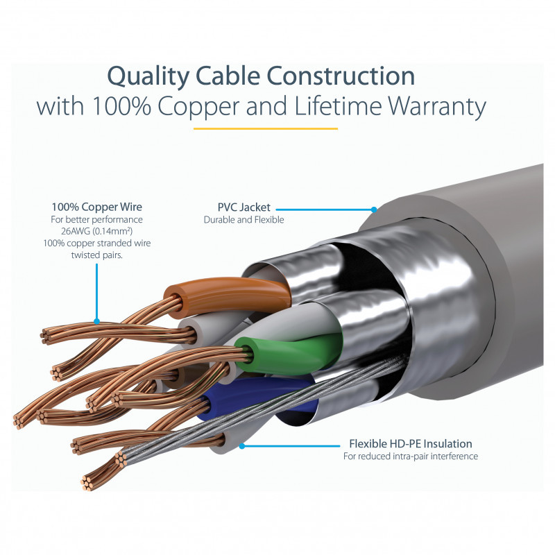 Constructed with 100% copper and foil-shielded, twisted-pair wiring, this cable was built for quality performance. The cable is designed to keep the data signals traveling through your network free from interference and is perfect in environments that are prone to large amounts of EMI.