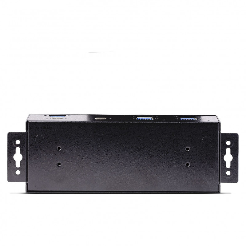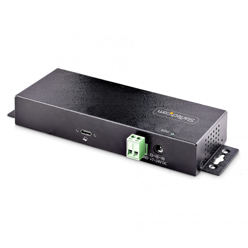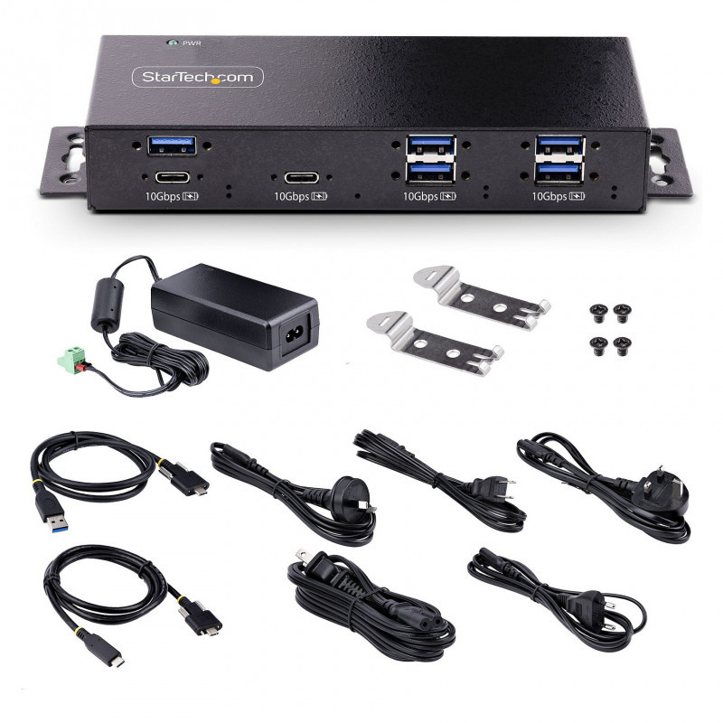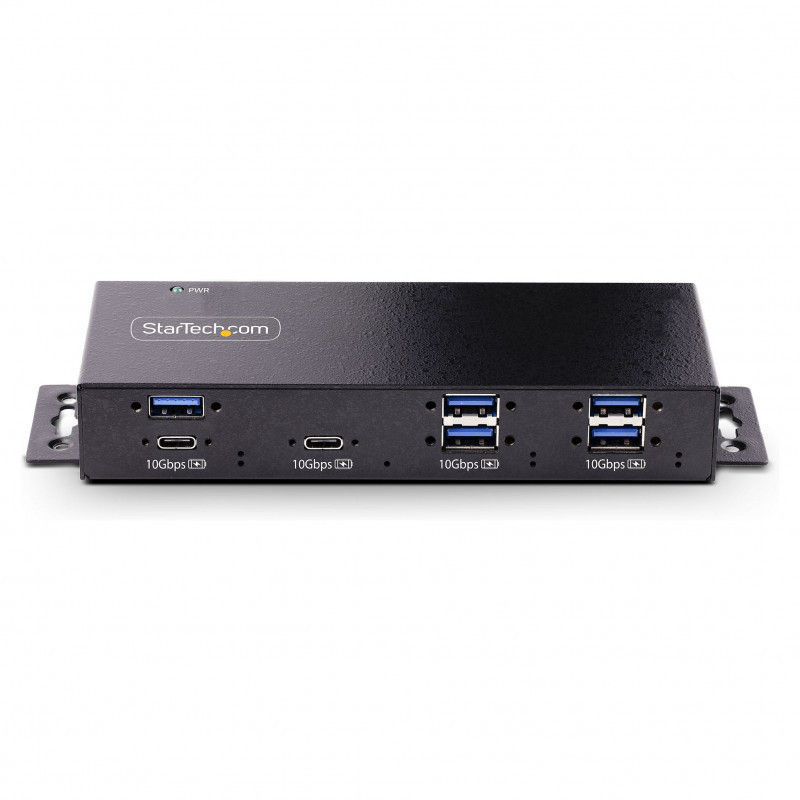 "StarTech.com 7-Port Industrial USB 10Gbps Hub with Power Adapter, Metal, Mountable, 5x USB-A and 2x USB-C Downstream Ports, ESD Protection, Powered USB Hub, TAA. Host interface: USB 3.2 Gen 2 (3.1 Gen 2) Type-C, Hub interfaces: USB 3.2 Gen 2 (3.1 Gen 2) Type-A, USB 3.2 Gen 2 (3.1 Gen 2) Type-C. Data transfer rate: 10000 Mbit/s, Product colour: Black, Housing material: Steel. Power supply type: DC, Input voltage: 100 - 240 V. Width: 26 mm, Depth: 60 mm, Height: 178 mm. Package width: 290 mm, Package depth: 187 mm, Package height: 70 mm"\n"Add 7 external, wall mountable USB 3.2 (10Gbps) ports from a single USB-C connection