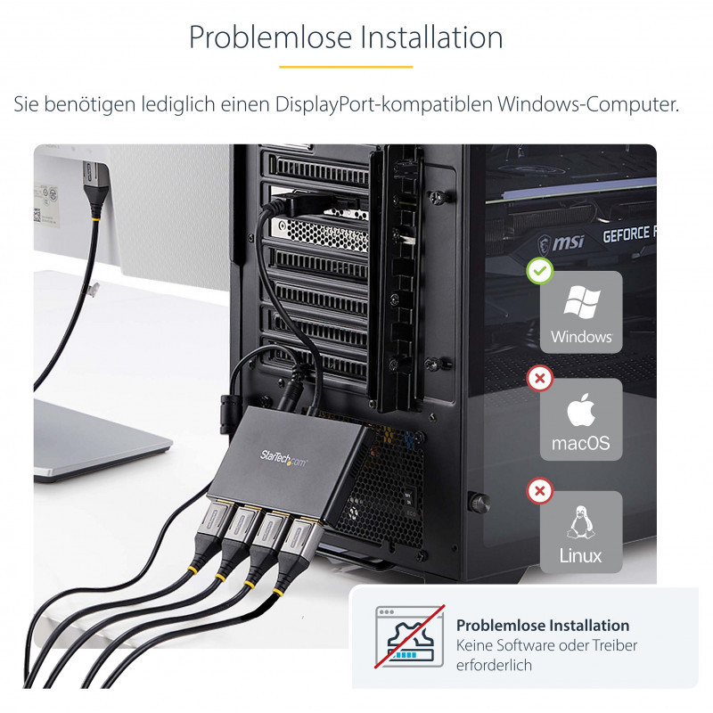 This MST hub lets you connect four monitors to your DisplayPort™ (DP) 1.2 equipped Windows® laptop or desktop.