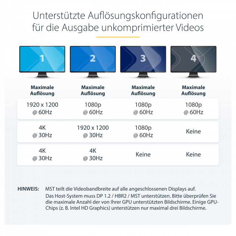 Note: MST shares 21.6 Gbps across all attached displays. Higher resolutions can restrict the available bandwidth with the remaining ports, please see our guideline below for determining an ideal resolution for your setup. Certain graphics adapters have limited MST support and will only output to three displays in total. If more than three monitors are attached the fourth will be disabled.