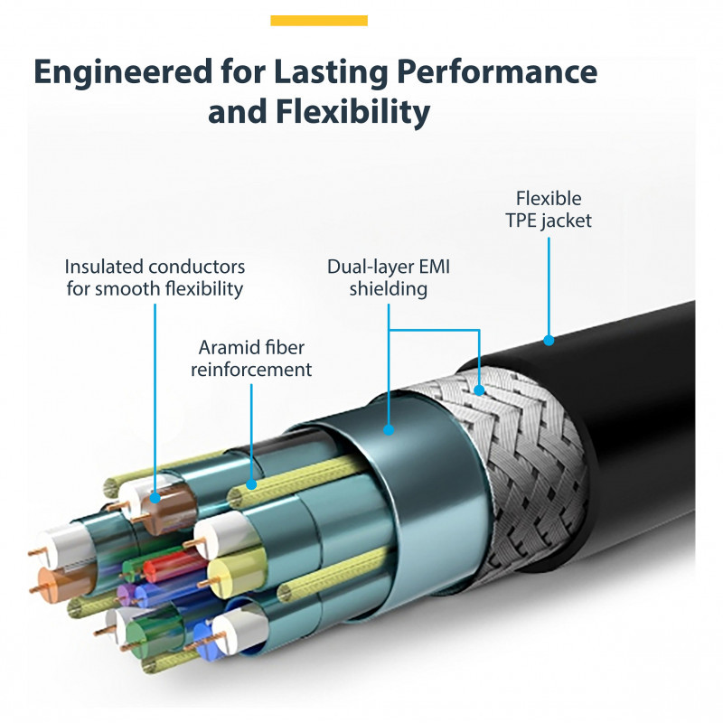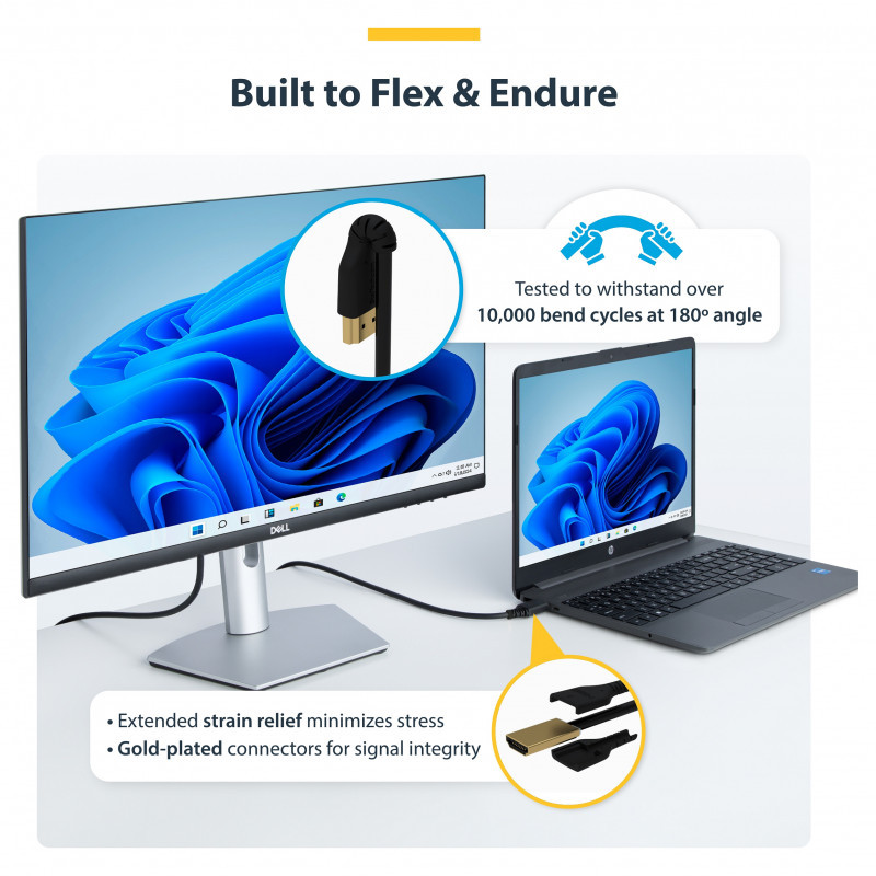 The Premium Certified Slim HDMI® 2.0 cable has aramid fiber reinforcement that braces it from the stress of frequent bends. This also lets the cable flex without over-stretching or damaging the core of the cable.