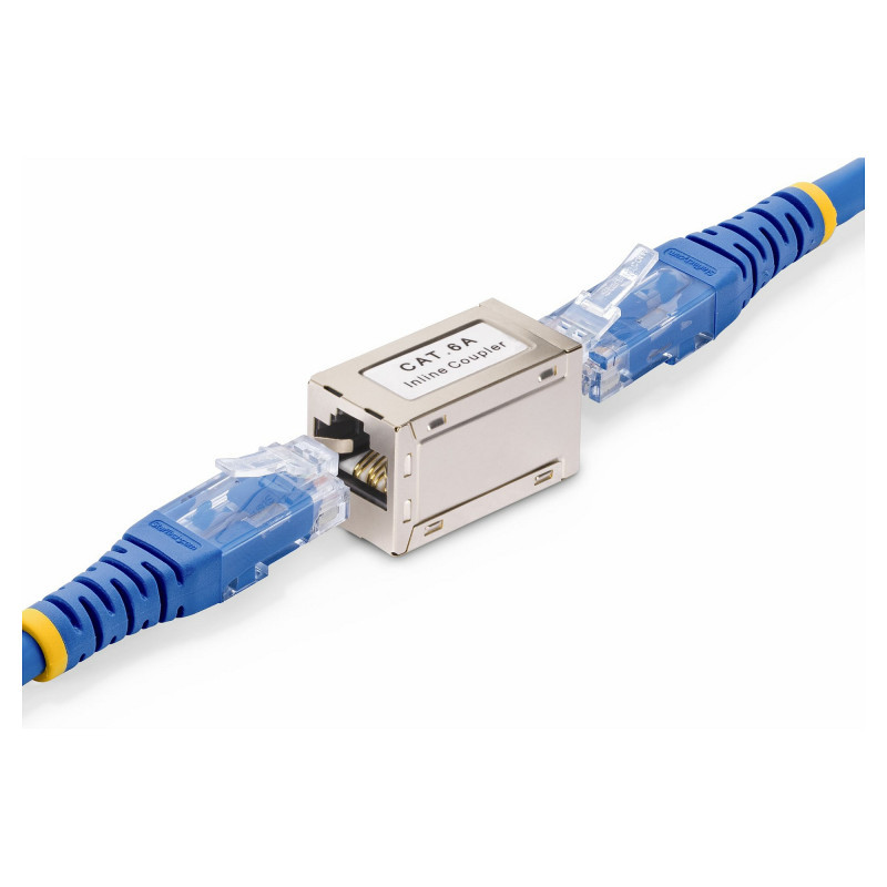 "StarTech.com Shielded RJ45 Coupler, Inline Cat6a Coupler, Female to Female (F/F) T568B Pinout, Shielded Ethernet Cable Extension. Connector 1: RJ-45, Connector 2: RJ-45, Connector contacts plating: Gold. Product colour: Silver"\n"Join two shielded RJ45 Cat6a cables using this Inline Coupler