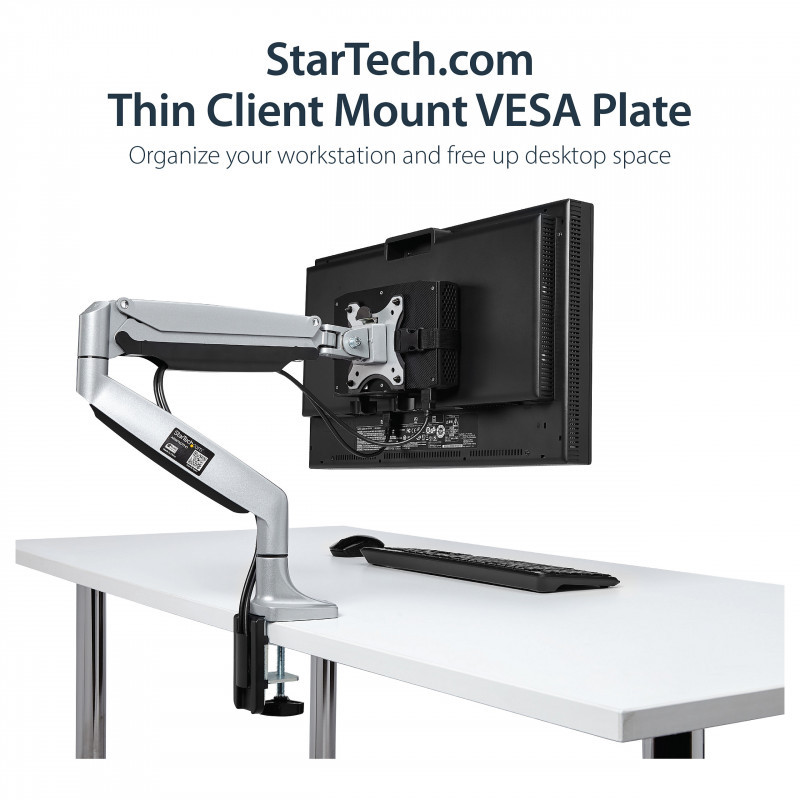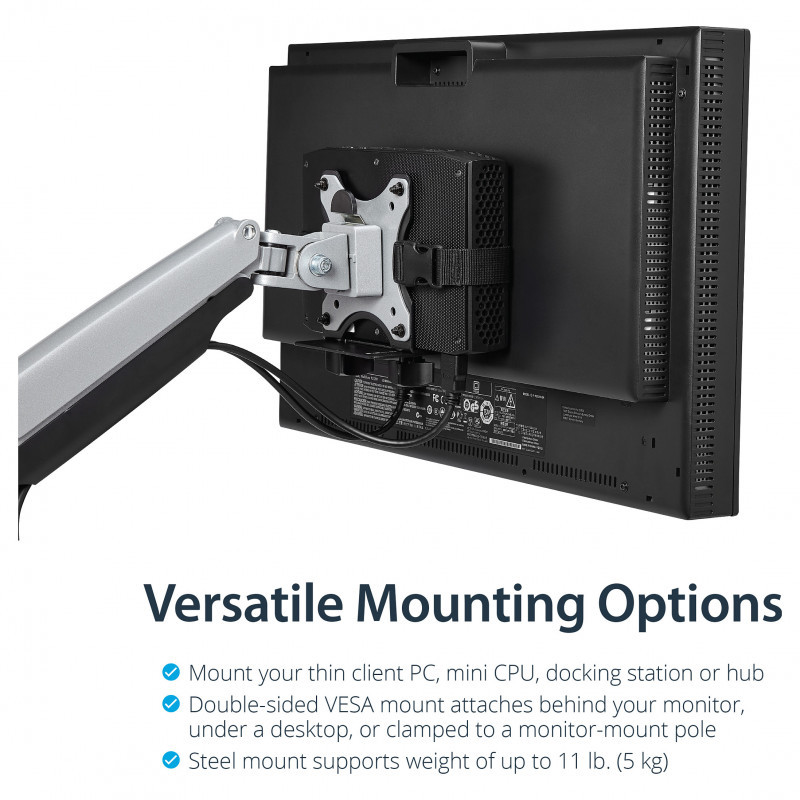 "StarTech.com Thin Client Mount - VESA Mounting Bracket. Type: Monitor stand-mounted CPU holder, Recommended chassis type: Small Desktop, Maximum weight capacity: 5 kg. Width: 80 mm, Width adjustment range: 17 - 70 mm, Depth: 118 mm"\n"Save space and neatly mount your docking station, thin client or USB hub to a VESA mount, behind your monitor, or under your desk