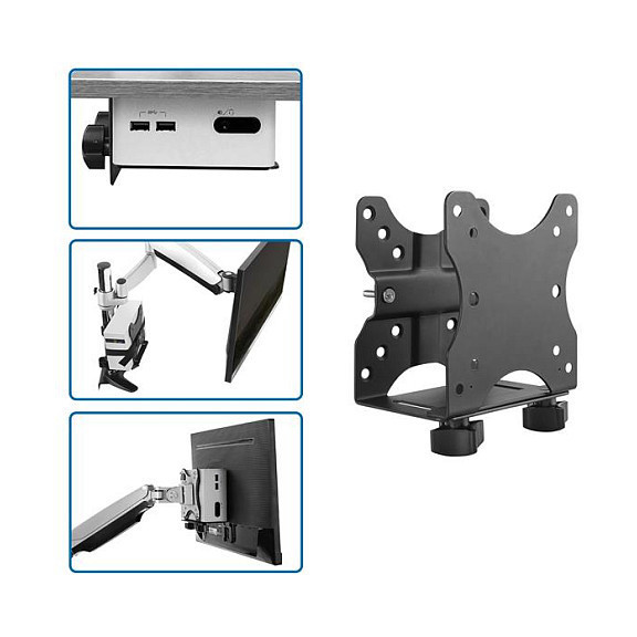 The versatile double-sided VESA mount offers several installation options, enabling you to mount your thin-client PC or dock to the back of your monitor or under your desktop, or clamp it to a monitor-mount pole. The mount supports 75x75, and 100x100 VESA mount compatibility, making it suitable for most monitors and monitor mounts.