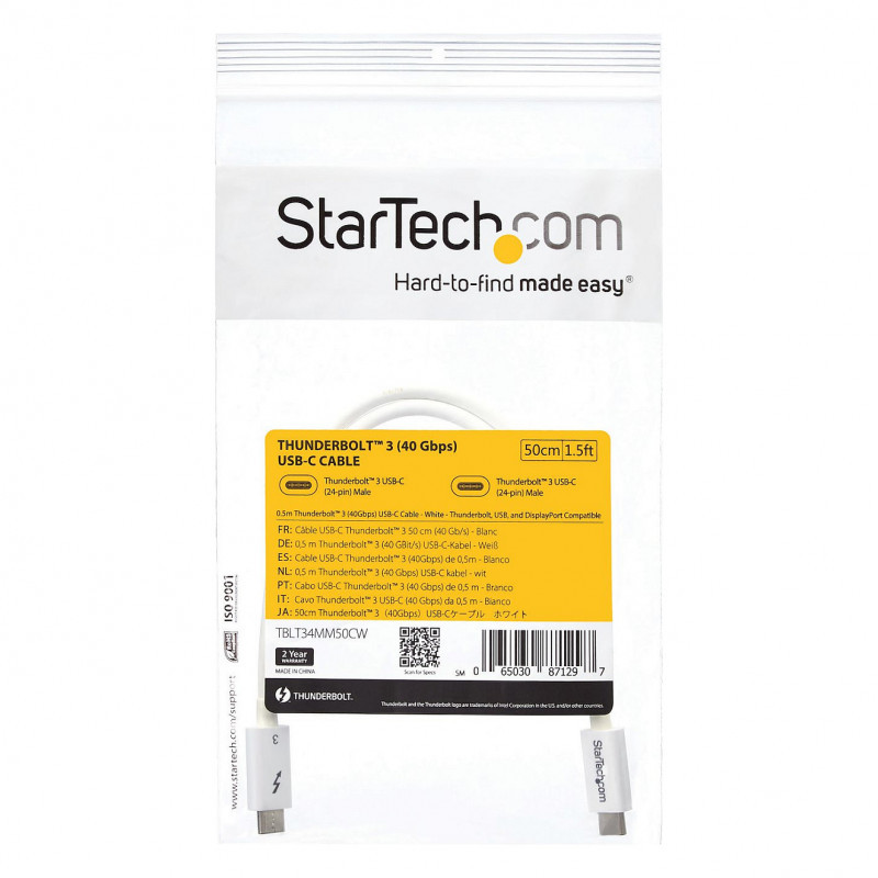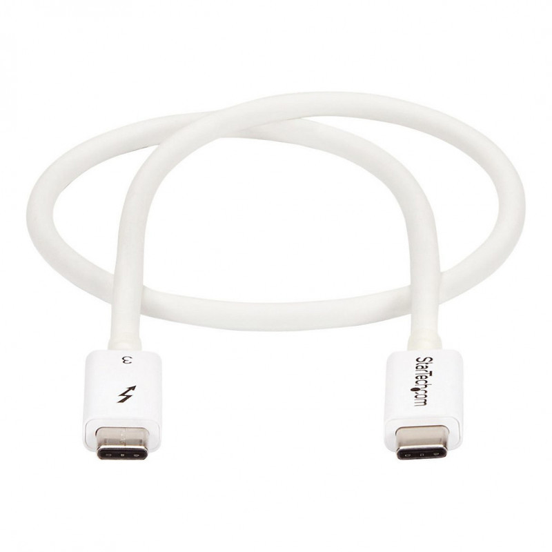 "StarTech.com Thunderbolt 3 Cable - 40Gbps - 0.5m - White - Thunderbolt, USB, and DisplayPort Compatible. Connector 1: Male, Connector 2: Male, Cable length: 0.5 m. Compliance certificates: RoHS. Weight: 21 g. Quantity per pack: 1 pc(s), Package width: 124 mm, Package depth: 221 mm. Products per master (outer) case: 60 pc(s), Master (outer) case length: 442 mm, Master (outer) case width: 299 mm"\n"Provide four times the data transfer speed of any other cable type, enable dual 4K 60Hz video, and power your devices with a single cable