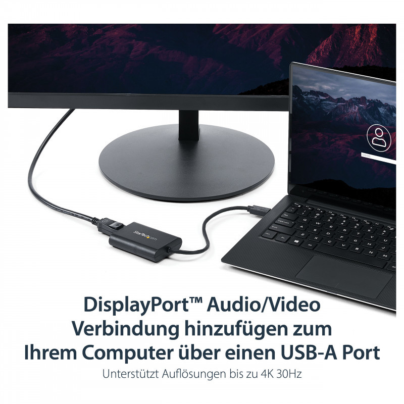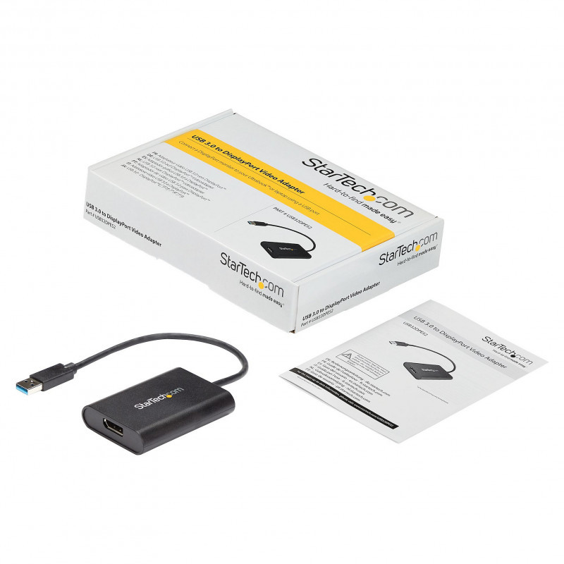 "StarTech.com USB 3.0 to DisplayPort Adapter, USB DP Monitor Converter for Windows, 4K (no support for macOS/ChromeOS/Linux) - TAA. USB version: 3.2 Gen 1 (3.1 Gen 1), USB connector type: USB Type-A, USB connector gender: Male. Product colour: Black, Housing material: Plastic. Windows operating systems supported: Windows 10, Windows 10 Education, Windows 10 Education x64, Windows 10 Enterprise, Windows 10..., Minimum processor family: Core i5, Minimum processor speed: 2.4 GHz. Width: 55 mm, Depth: 75 mm, Height: 16 mm. Package width: 144 mm, Package depth: 210 mm, Package height: 38 mm"\n"USB 3.0 External Video & Graphics Card | Multi-Monitor | USB-Powered | Supports Windows®